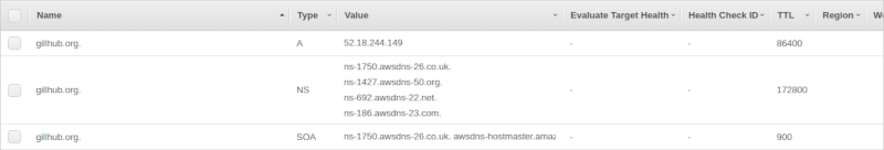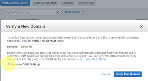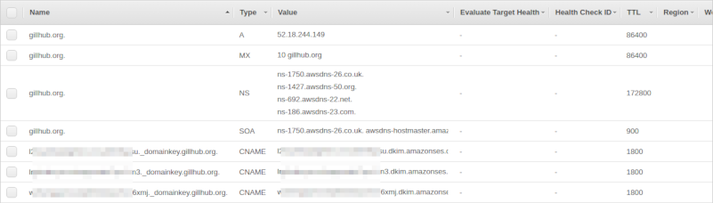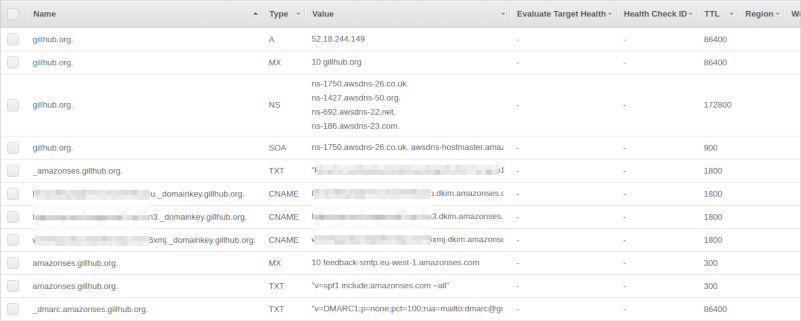 Upload settings to Route 53. Unless you want to make Amazon SES also handle incoming email, go with the default of not uploading the MX record. This is probably a good time to add that MX record manually in Route 53 - I want to handle incoming email myself and added MX "10 gillhub.org". After verifying the domain you should get two emails, one when Amazon has verified the domain and one when Amazon has verified the DKIM settings. After verifying domain and adding the MX record manually the Route 53 hosted zone should look something like this: